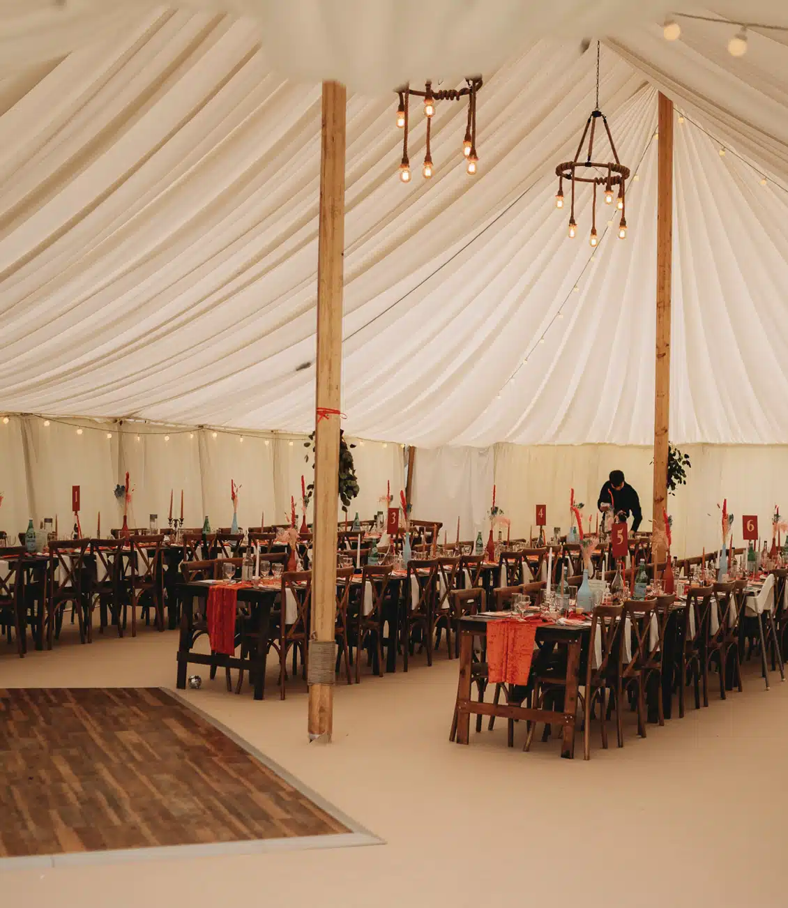 The marquee itself was rustic with wooden poles and wood finials, to give the vintage appearance, but with all of the advantages of a modern manufactured tent.
