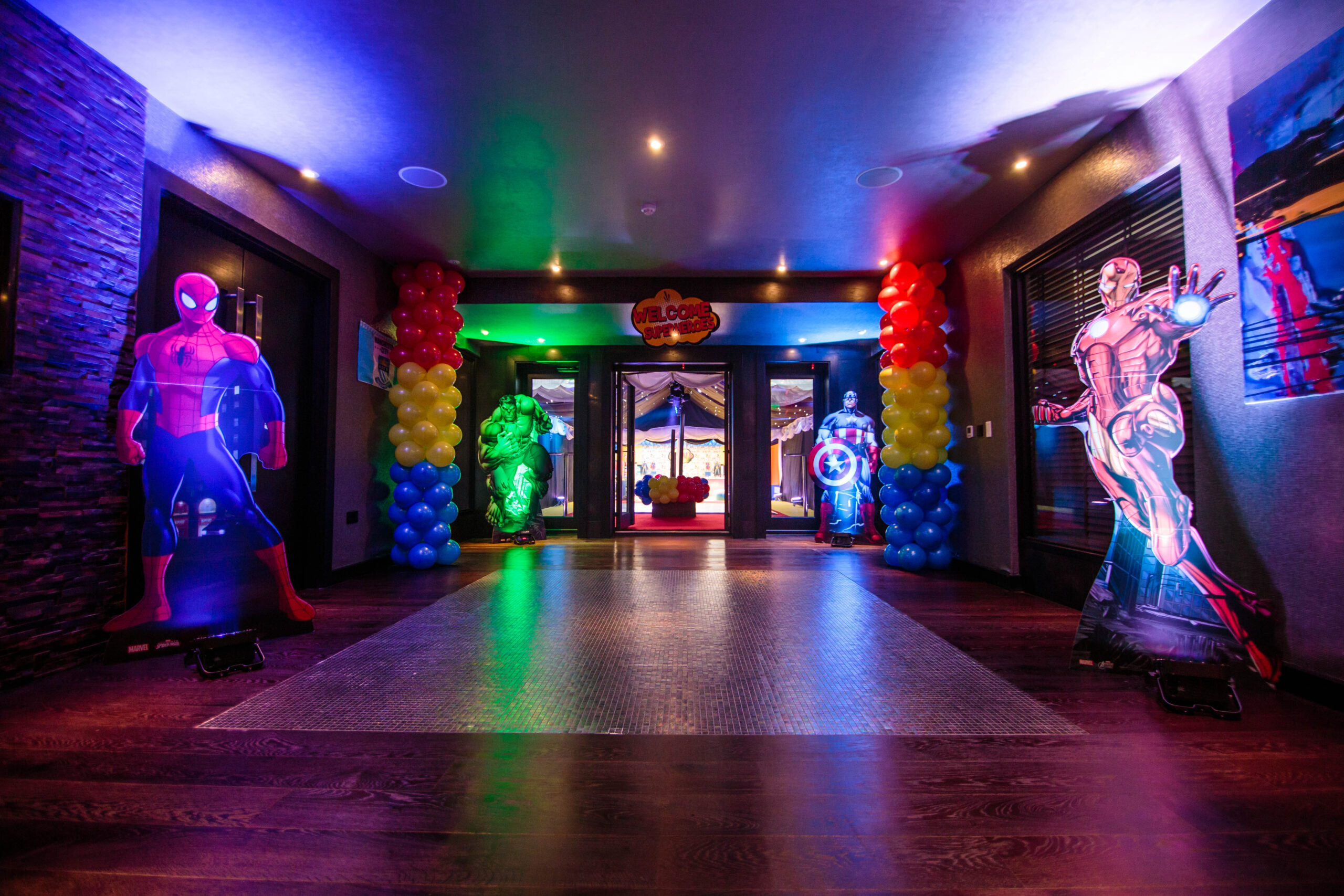 The first section of the structure was a 6m x 9m Clearspan marquee adjoining French doors into the property to provide a disco room with starlight linings and black and white dance floor. The 6m x 9m was then in turn linked onto a 12m x 12m clearspan marquee lined in white with red and yellow carpet to add to the super hero theme.