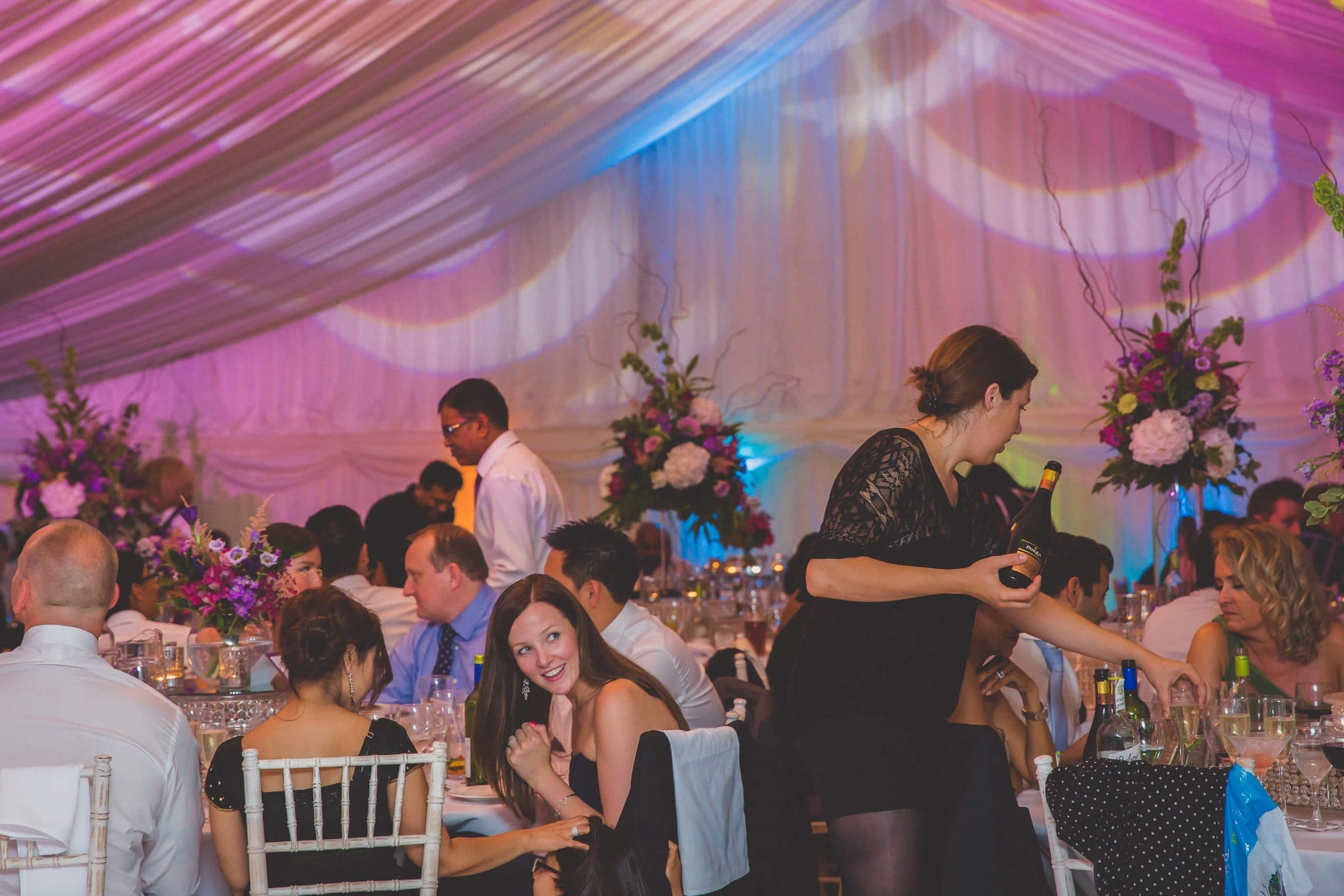 Along with providing clearspan marquee hire, A&M Marquees were also asked to provide additional furniture and accessories to transform the Knutsford wedding marquee. By pairing dove grey carpets with a white LED dance floor, A&M Marquees also provided purple lighting with matching flowers and accents on the seat pads all combined to create a slick modern look to the wedding marquee venue.