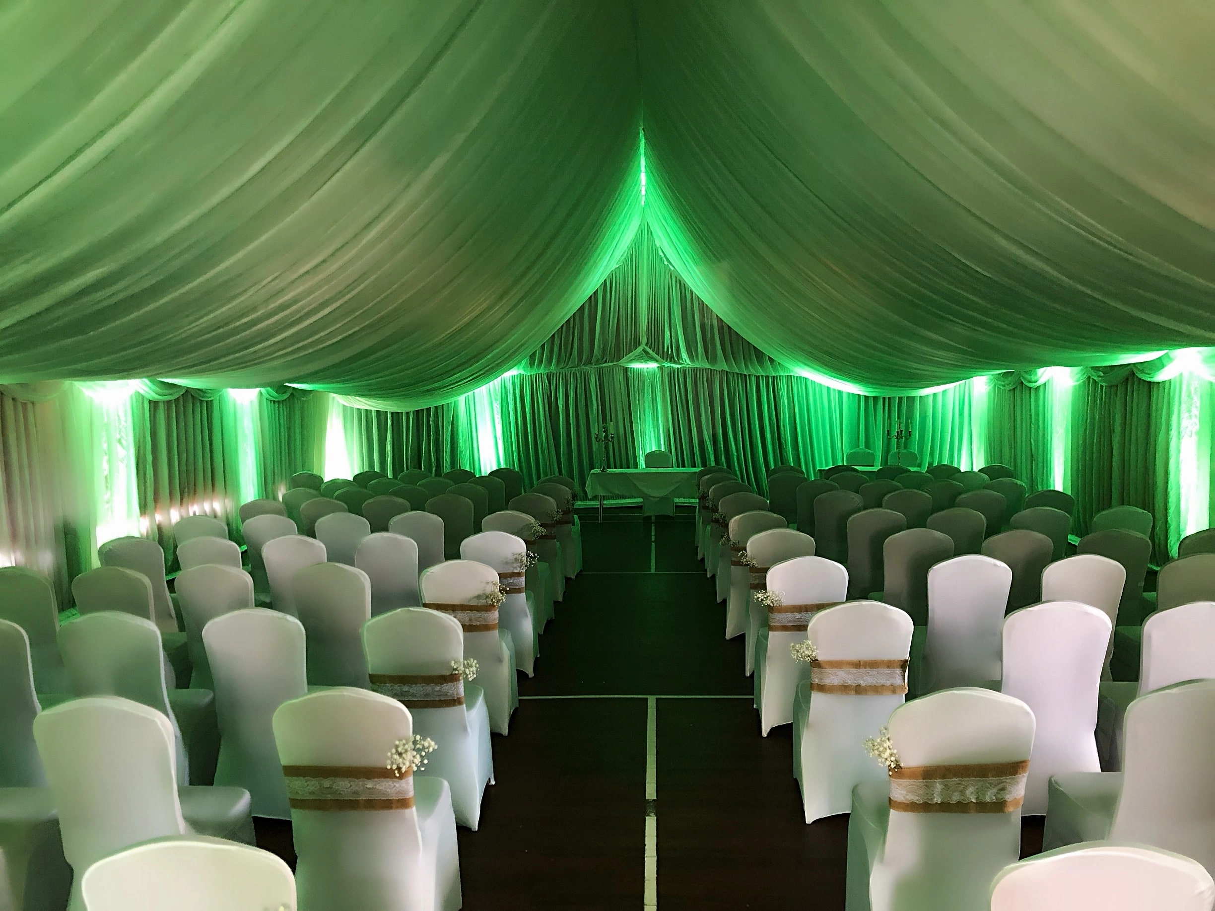 This hall lining was supplied to Woodford Community Center for a wedding ceremony along with the lighting to transform what would be a basic village hall. This type of lining is available to hire in white as seen here, black with LED lights (star cloth), ivory, or beige to transform a sports hall, village hall or agricultural barn.
