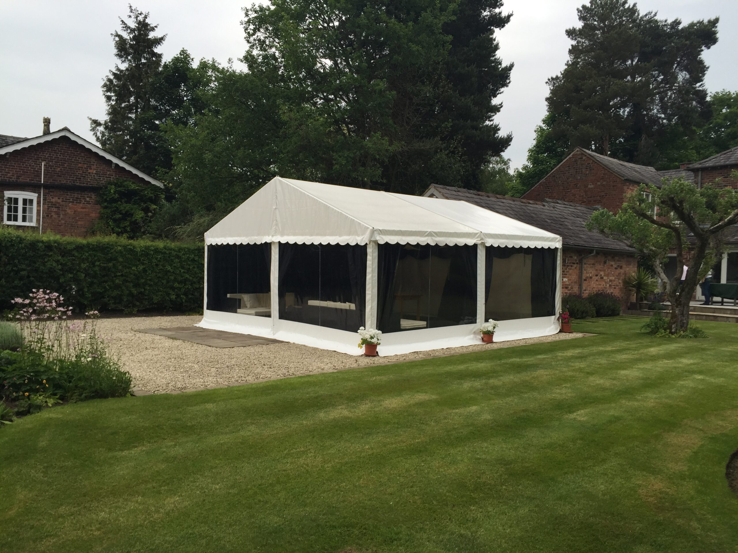This small clearspan marquee was supplied to one of our regular A&M Marquee clients to celebrate a 21st birthday party in Wilmslow, Cheshire. The clearspan marquee was linked on to the customer’s garage which was then lined with black marquee linings to provide a party venue in a smaller space. The clearspan marquee included matching marquee carpets along with a themed black and white dance floor, lighting and a sound system. As you can see from the pictures, A&M Marquees really transformed this small garden into a party venue. Our clearspan marquees are available from as small as 3m to 15m so we can cater anywhere from 20 to over 1,000 guests for any event or occasion. Please see our marquee furniture and accessories for an idea on what we can provide for your party.
